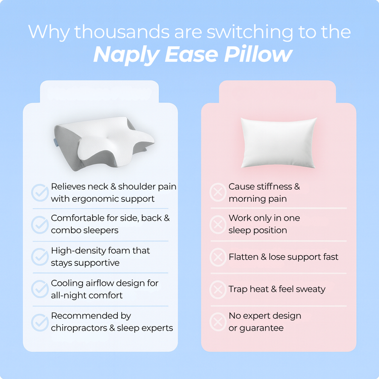 Discover the Naply Ease Pillow’s ergonomic design that cradles your neck and spine for impeccable alignment. Experience memory foam that adjusts to your shape for a personalized sleep every night.